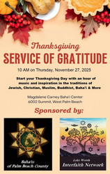 Gratitude is a virtue which all faith traditions share. Over the past 20 years, Lake Worth Interfaith Network has brought together peoples of diverse beliefs to share in celebrating our common humanity and desire for the well-being of each other in this beloved country. Whether you have attended in the past or are a first-timer, whether you identify with a particular faith or not, you are welcome and sure to be inspired. Music, movement, short presentations, light refreshments.